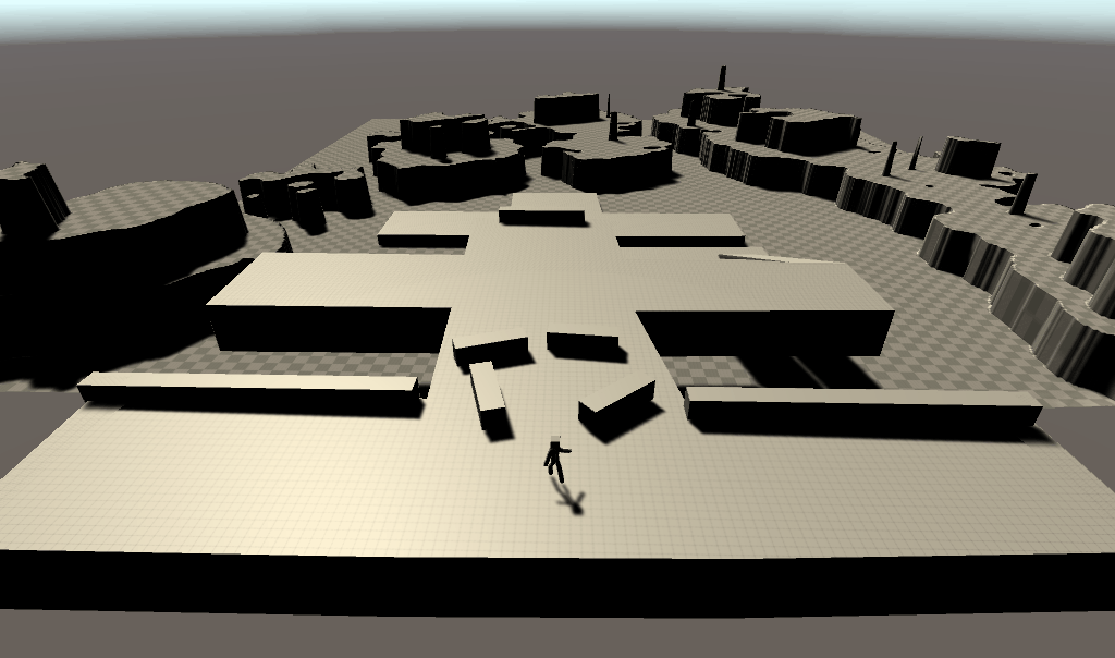 This is a scene from the next up and coming extravaganza that is CubicSquaredGameDemoThing. The scene demonstrates the amazingly intelligent artificial intelligence using Unity's NavMesh. In the scene, the spawned enemies (made using raycasts) being to chase the player character until he eventually falls off the edge of the map.